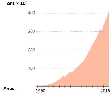 Atualmente são produzidas 400 milhões de toneladas de plástico por ano, com uma taxa de crescimento acentuada desde o início dos registros, como mostra o gráfico abaixo: