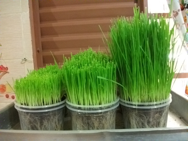 COLHEITA: os Brotos estão prontos para comer quando aparecem as duas primeiras folhas ou no caso das gramas, com 15 cm de altura. Lembrando que as gramas, oriundas de cereiais ricos em amido, geram 3 colheitas como na foto abaixo.