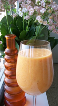 Ficou deliciosa e até tirei a foto lá em cima. Mas depois coei na panela furada 1 para ficar aquela vitamina bem lisinha... Hummm!