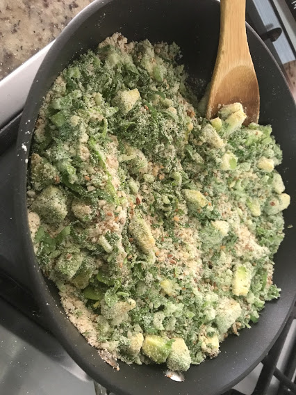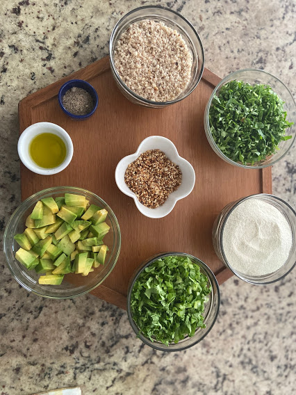 Ingredientes: 1 1/2 xícara (chá) de farinha de mandioca crua + 1 xícara (chá) de castanha do pará ralada (processada na lâmina S do processador) + 2 colheres (sopa) de pipoca de linhaça com gergelim (VER RECEITA ABAIXO) + 2 colheres (sopa) de azeite de oliva (poderia ser de coco) + 1 xícara (chá) de folhas de mostarda picada e repicada + 1 xícara (chá) de agrião picado + 1 xícara (chá) de abacate em cubos + Sal integral.