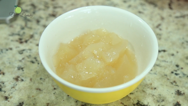Preparo gel da gracilária: 1 xícara (chá) da alga previamente lavada e hidratada por 12 horas ('cozida' no suco e cascas de 1 limão) conforme imagem abaixo. Costumo trocar esta água de hidratação por 2 vezes, mantendo as cascas do limão. Finalmente, drenar toda a água de hidratação.